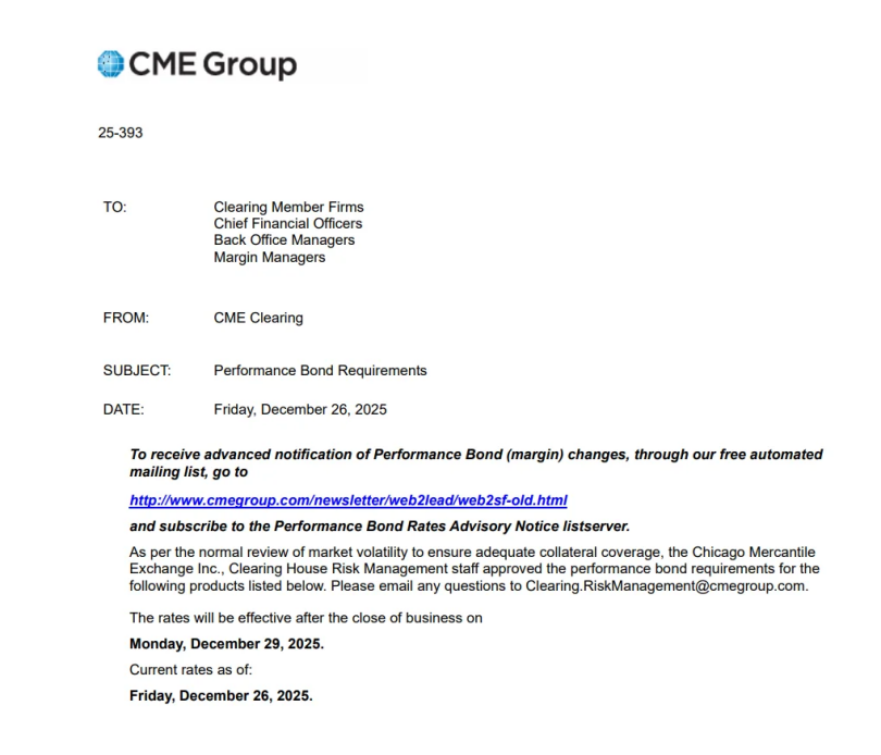 消息面上,芝商所(CME Group)于12月26日发布重大保证金调整通知称,将于12月29日(星期一)收盘后,全面上调黄金、白银、锂等金属期货品种的履约保证金。
